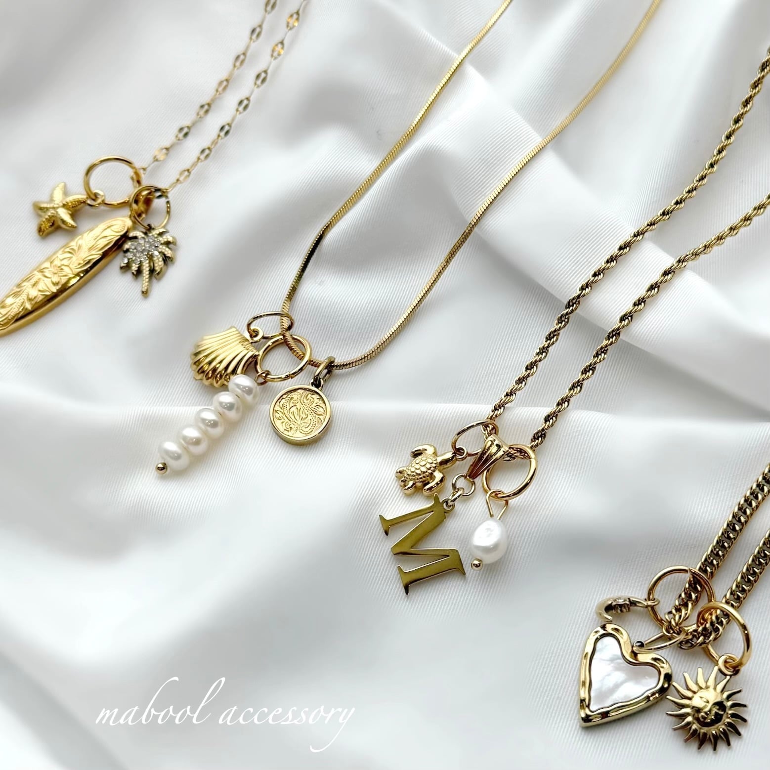 maboolだけのチャームカスタム。 手作業で制作しているからこそできる事を。 ネックレスに好みのチャームをカスタムし特別な1本にできます。 沢山の方に喜んでいただきありがとうございます。 イニシャルや誕生石など自分にしか分からない 意味は特別でお守りにも。 大切な恋人や家族などとペアにされる方も多く プレゼントにも人気です。 ーーーーーーーーーーーーーー ⚠︎記載された金額でご購入できるのはネックレス、ブレスを購入された方限定です。 チャーム単品でご購入希望の場合は、商品選択時に【チャーム単品購入+¥900】を選択してください。 ⚠︎購入の際は商品と一緒にカートに入れご購入ください。 ーーーーーーーーーー 金属アレルギー対応/ステンレス素材 ーーーーーーーーーー 【ご購入方法】 ネックレスまたはブレスと一緒にご購入ください。 カテゴリのカスタムチャームから、または商品名に【charm】とついているものが対象です。 一緒にご注文されたネックレスなどにチャームをつけて製作いたします。 ※数点一緒にご注文いただいている場合は どのネックレスにどのチャームをつけるのか ご希望を備考にご記入ください。 また、デザイン希望をお伺いするため、メールを送らせていただく場合がございます。 イニシャルによって付け方、写真と大きさやデザインが多少変更する場合があります。 1番最適な付け方でつけさせていただきます。 (指定はできません) 《取り外し可能チャーム希望について》 ご自身でチャームを取り外し、お好みでデザインを変えられます。 ご希望の方は、バチカン、丸カン大希望を選択してください。 ※チャームの種類や、ネックレスのデザインにより元々バチカンでの取り付けもしております。 ⚠︎マンテルデザインのネックレスは、取り外し不可です。 また、ご不明な点ありましたら お問い合わせください。