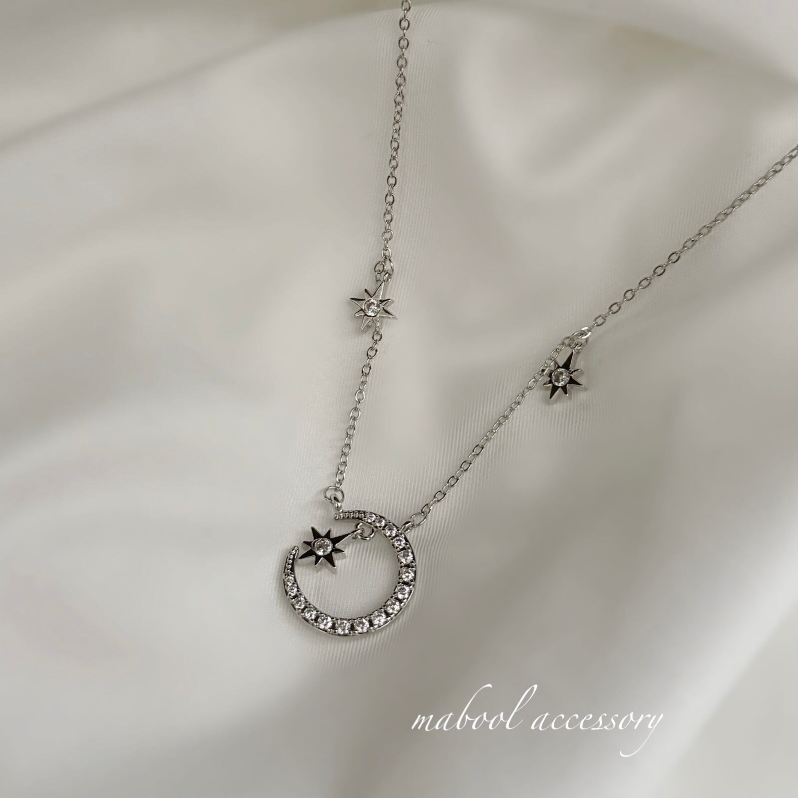 ストーンをあしらった三日月と、揺れる星チャームが胸元でやさしく輝きます。