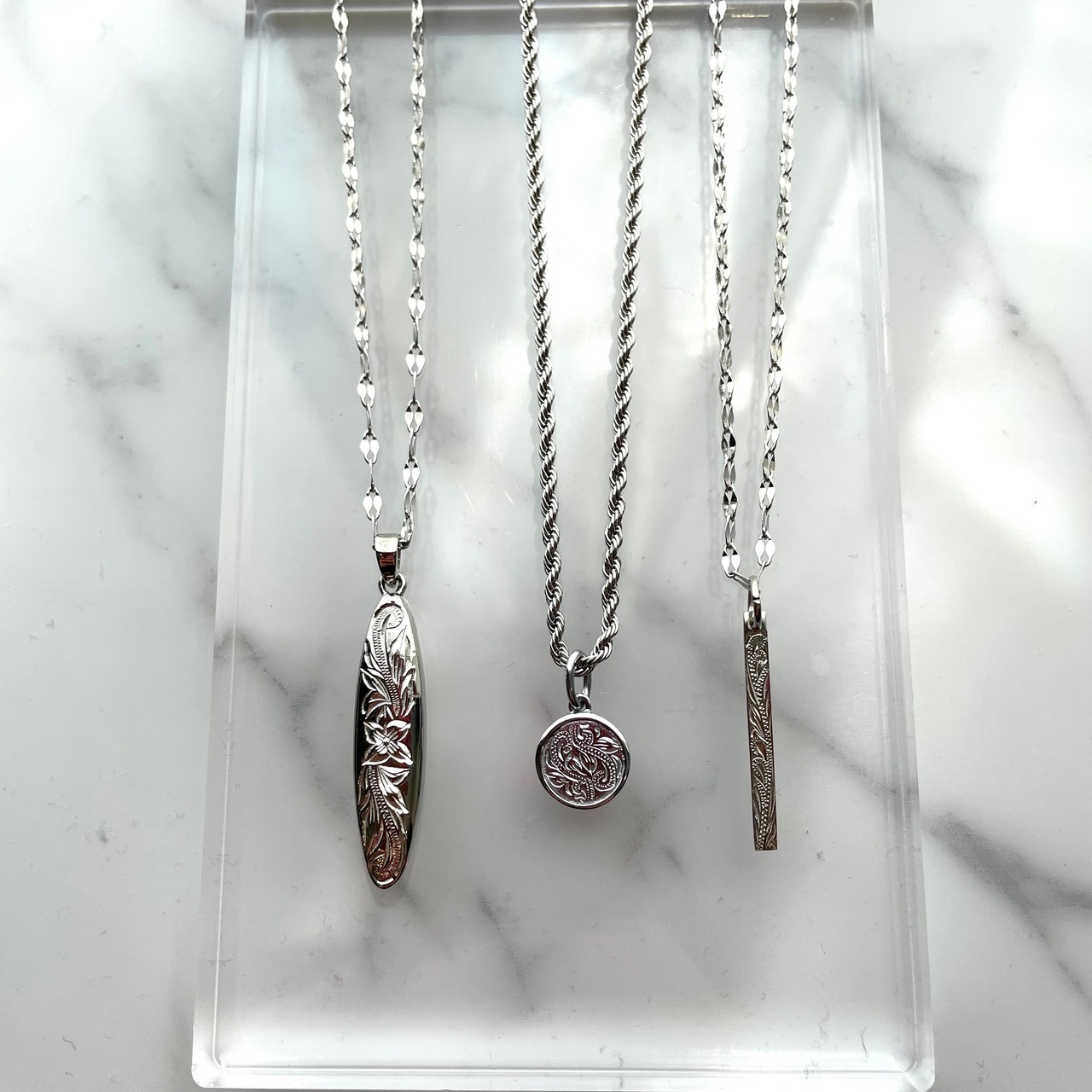 ハワイアンジュエリーのサーフボード型のトップがポイントのネックレスです。