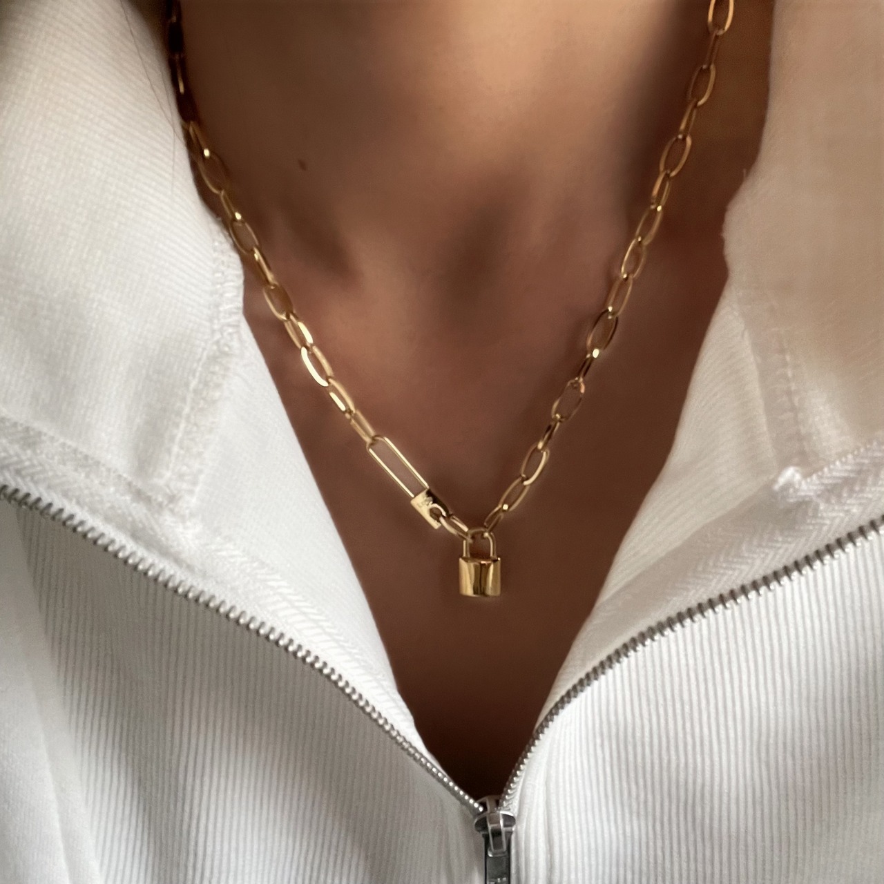 小さめのパドロックモチーフは大人の女性にも取り入れやすいアイテム。